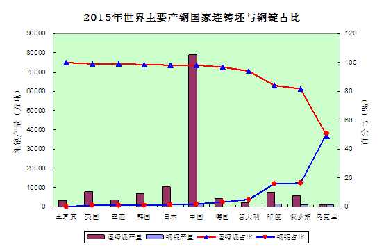 表2 2015年世界主要產(chǎn)鋼國家連鑄坯與鋼錠在粗鋼總產(chǎn)量中的占比情況