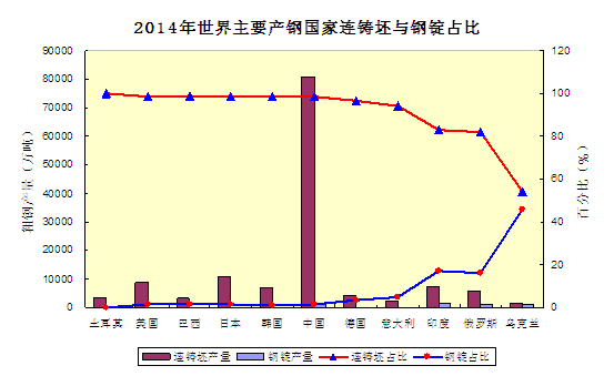 表1 2014年世界主要產(chǎn)鋼國家連鑄坯與鋼錠在粗鋼總產(chǎn)量中的占比情況