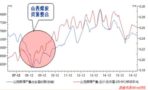 08年開始的煤炭資源整合使得山西的煤炭產(chǎn)量下了一個臺階,并使得后續(xù)幾年的產(chǎn)量釋放持續(xù)受到抑制。從而抬高了煤炭,尤其焦煤(山西省焦煤市場份額占全國一半,遠高于煤炭總體的25%)的周期景氣高度,延長了景氣周期的時間。即便2008年發(fā)生金融危機,2009年后,焦煤早于其它大宗商品行業(yè)率先復(fù)蘇,很快回到較高利潤狀態(tài)。