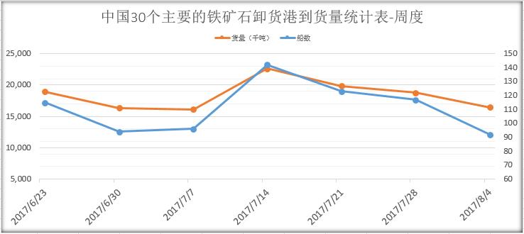 圖7 中國30個(gè)主要鐵礦石卸貨港到崗量統(tǒng)計(jì)表(周度)