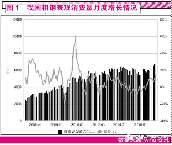 從鋼鐵行業(yè)產(chǎn)業(yè)鏈來講,作為一個中游產(chǎn)業(yè),產(chǎn)品主要包括各種普鋼(如螺紋鋼、線材)和特鋼(如不銹鋼、結(jié)構(gòu)鋼)等。其上游主要包括原材料鐵礦石,生產(chǎn)資料煤炭、電力等;下游需求端非常廣泛,包括建筑、建材、機械、汽車、家電、房地產(chǎn)、交運設(shè)備等。分重點品種來看,螺紋鋼對應(yīng)房地產(chǎn)和基建投資,熱卷對應(yīng)機床和船舶產(chǎn)量,冷軋對應(yīng)汽車和冰箱產(chǎn)量,中厚板對應(yīng)造船噸位。目前,成本端暫時并不存在擠壓利潤的因素,其上游鐵礦石因主要來自進(jìn)口,目前價格穩(wěn)定在低位,庫存比較充足,且打擊“地條鋼”清理出來的廢鋼對其有一定替代作用。需求端看,從2016年下半年開始,中國GDP增速、固定資產(chǎn)投資和房地產(chǎn)投資等宏觀指標(biāo)均表現(xiàn)超預(yù)期,弱復(fù)蘇支持下游需求增加,基建投資累計同比增速在2月達(dá)到21.26%的年內(nèi)高點,房地產(chǎn)投資完成額同比增速達(dá)到遠(yuǎn)超預(yù)期的8.9%,鋼材庫存下降,消費量增加(如圖1).