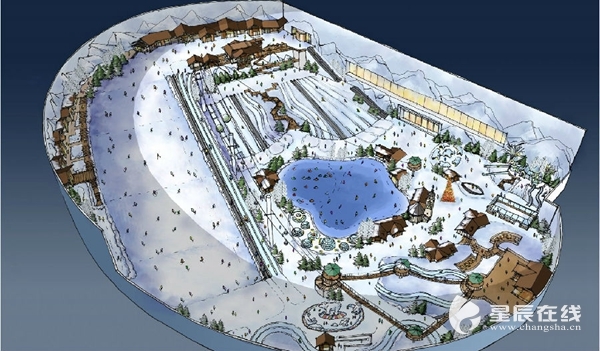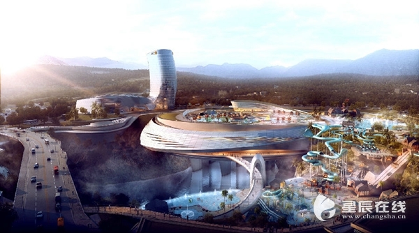 (湘江歡樂城歡樂雪域項(xiàng)目“懸浮”于百米礦坑之中,因四周都是懸崖峭壁,整個(gè)建筑就像一個(gè)“孤島”。資料圖)