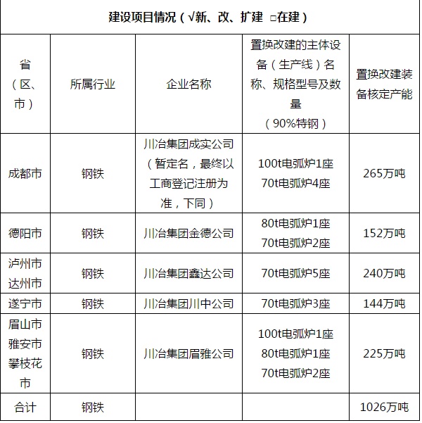 經(jīng)四川省政府同意,按照《國務(wù)院關(guān)于化解產(chǎn)能嚴(yán)重過剩矛盾的指導(dǎo)意見》(國發(fā)〔2013〕41號(hào))、《國務(wù)院關(guān)于鋼鐵行業(yè)化解過剩產(chǎn)能實(shí)現(xiàn)脫困發(fā)展的意見》(國發(fā)〔2016〕6號(hào))、《工業(yè)和信息化部關(guān)于印發(fā)部分產(chǎn)能嚴(yán)重過剩行業(yè)產(chǎn)能置換實(shí)施辦法的通知》(工信部產(chǎn)業(yè)〔2015〕127號(hào))等文件要求,現(xiàn)將四川省地方冶金控股集團(tuán)有限公司鋼鐵企業(yè)重組改造項(xiàng)目產(chǎn)能置換方案予以公告,置換項(xiàng)目列入年度淘汰計(jì)劃,歡迎社會(huì)公眾進(jìn)行監(jiān)督。