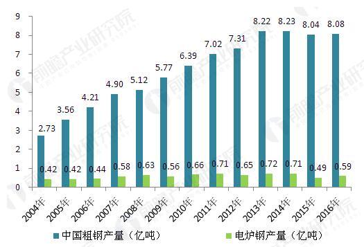 根據(jù)前瞻產(chǎn)業(yè)研究院的監(jiān)測數(shù)據(jù)顯示,2004年以來我國粗鋼產(chǎn)量增速明顯大于電爐鋼產(chǎn)量增速。2016年,我國粗鋼產(chǎn)量達到8.08億噸,電爐鋼產(chǎn)量為0.59億噸,電爐鋼占比僅為7.28%。