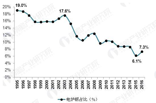 圖表2:1995-2016年我國電爐鋼產(chǎn)量占比變化趨勢圖(單位:%)