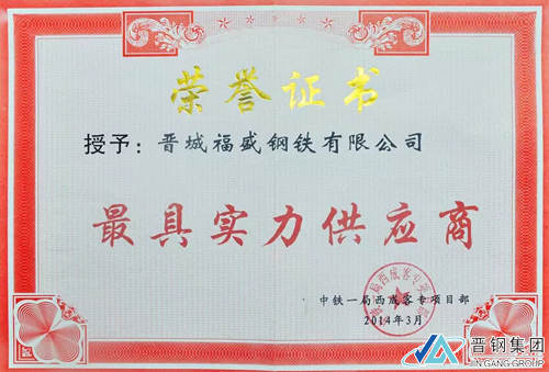 2014年3月,公司憑借過(guò)硬的產(chǎn)品質(zhì)量及周到的供貨服務(wù),贏得了西成客專項(xiàng)目部及施工單位的一致好評(píng),被中鐵一局西成客專項(xiàng)目部授予“最具實(shí)力供應(yīng)商”榮譽(yù)稱號(hào)。自2013年4月合作以來(lái),公司為該項(xiàng)目提供了大量的優(yōu)質(zhì)鋼材,產(chǎn)品質(zhì)量和服務(wù)質(zhì)量深受客戶認(rèn)可,晉鋼產(chǎn)品的使用有效地保證了工程質(zhì)量及施工進(jìn)度。