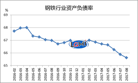據(jù)蘭格鋼鐵云商平臺監(jiān)測數(shù)據(jù)顯示,截止 2017 年 8月,鋼鐵行業(yè)整體債務規(guī)模合計 4.24萬億元,資產負債率為 65.62%,較2016年3月份的高點(68.0%)下降了2.38個百分點。