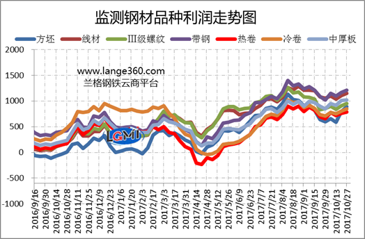 圖2是蘭格鋼鐵云商平臺監(jiān)測的各主要鋼材品種的盈利能力曲線對比。從圖2可以看出,10月份7大品種盈利狀況仍保持較高水平,但除中厚板外,其他品種平均利潤較上月略有收縮。