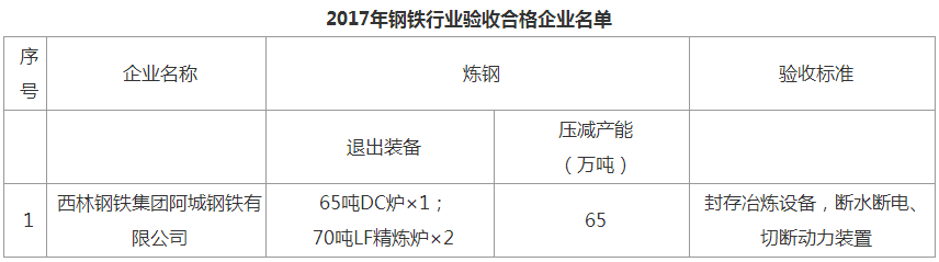 根據(jù)國(guó)家發(fā)改委《關(guān)于確認(rèn)鋼鐵行業(yè)2017年化解過剩產(chǎn)能目標(biāo)計(jì)劃的通知》,黑龍江省已經(jīng)完成了2017年鋼鐵行業(yè)化解過剩任務(wù)目標(biāo),壓減粗鋼產(chǎn)能65萬噸。按照國(guó)家發(fā)改委驗(yàn)收工作有關(guān)要求,組織開展了驗(yàn)收工作,65萬噸產(chǎn)能任務(wù)全部驗(yàn)收合格,現(xiàn)予以公告。