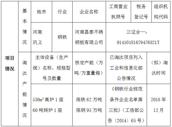 按照《河南省工業(yè)和信息化委員會(huì)關(guān)于印發(fā)河南省部分產(chǎn)能嚴(yán)重過剩行業(yè)產(chǎn)能置換實(shí)施辦法的通知》(工信部產(chǎn)業(yè)〔2015〕150號(hào))要求,河南昌泰不銹鋼板有限公司1×530m3煉鐵高爐(2號(hào))項(xiàng)目產(chǎn)能62萬(wàn)噸、1×60噸轉(zhuǎn)爐項(xiàng)目煉鋼產(chǎn)能95萬(wàn)噸產(chǎn)能出讓和85噸電爐1座普鋼產(chǎn)能94萬(wàn)噸產(chǎn)能需求擬在全國(guó)范圍內(nèi)發(fā)布置換產(chǎn)能指標(biāo),現(xiàn)將河南昌泰不銹鋼板有限公司產(chǎn)能置換指標(biāo)出讓信息(見附表)予以公告。