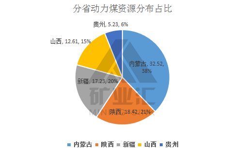 從各省、市、自治區(qū)動(dòng)力煤資源分布來(lái)看,內(nèi)蒙古自治區(qū)儲(chǔ)量最多,占全國(guó)動(dòng)力煤儲(chǔ)量的32.52%,其次是陜西、新疆、山西、貴州,分別占有18.42%、17.23%、12.61%和5.23%。