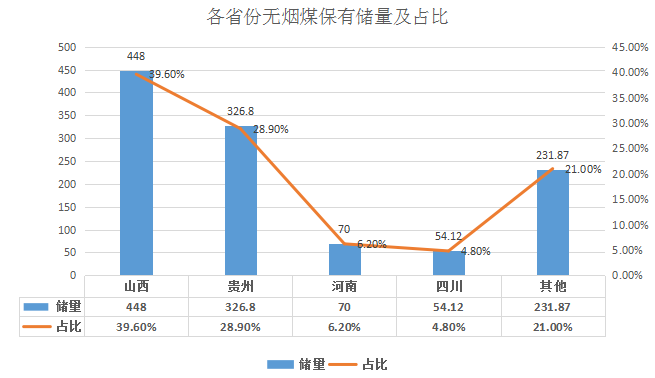 這四個(gè)省份無(wú)煙煤的保有資源儲(chǔ)量分別為:山西448億噸,占中國(guó)無(wú)煙煤保有儲(chǔ)量的39.6%;貴州326.80億噸,占中國(guó)無(wú)煙煤保有儲(chǔ)量的28.9%;河南,70億噸,所占比例為6.2%;四川,54.12億噸,占中國(guó)無(wú)煙煤保有儲(chǔ)量的4.8%。