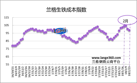 從圖1蘭格生鐵成本指數(shù)走勢圖可以看出,2018年2月份的生鐵成本指數(shù)呈先升后降走勢,由月初的103.9點變化至月末的98.7點,均值較上月上升2.9%。