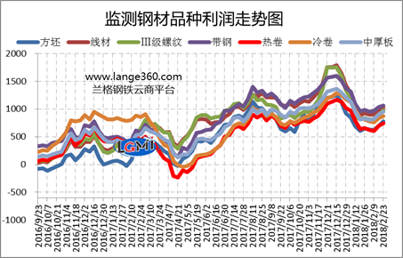 圖2是蘭格鋼鐵云商平臺監(jiān)測的各主要鋼材品種的盈利能力曲線對比。從圖2可以看出, 2018年2月份7大品種平均測算毛利呈穩(wěn)重趨升狀態(tài),但均值較上月仍有小幅下降,下降幅度在19-123元之間,盈利空間收窄最明顯的是冷軋卷板,最小的是方坯。