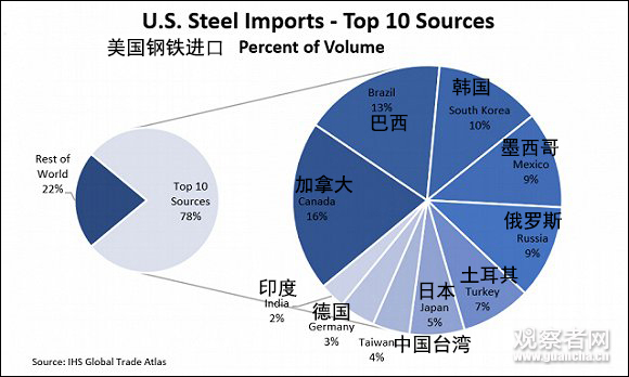 金融時報在另外一份報道中稱,美國官方貿(mào)易數(shù)據(jù)顯示,2017年,中國僅占美國鋼鐵進口總量的約2%。