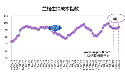 從圖1蘭格生鐵成本指數(shù)走勢圖可以看出,2018年3月份的生鐵成本指數(shù)呈先降后升走勢,由月初的97.6點變化至月末的99.4點,均值較上月下降3.7%。