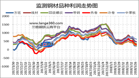 圖2是蘭格鋼鐵云商平臺監(jiān)測的各主要鋼材品種的盈利能力曲線對比。從圖2可以看出, 2018年3月份7大品種測算毛利基本呈持續(xù)下降狀態(tài);從全月盈利均值來看,除中厚板毛利均值較上月有明顯上升外,其他品種毛利均值略有改善,改善幅度在30元以下;中厚板3月份毛利均值較上月上升177元。