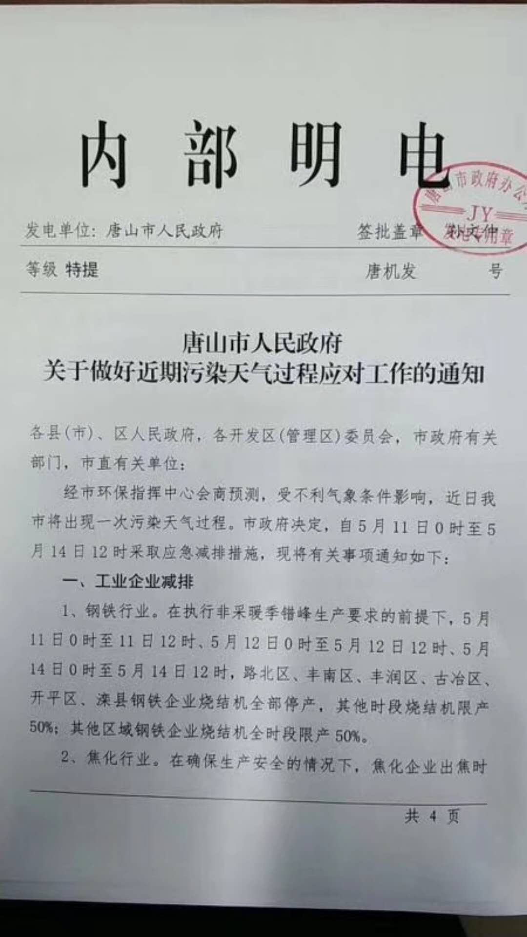 唐山市政府發(fā)布《關(guān)于做好近期污染天氣過(guò)程應(yīng)對(duì)工作的通知》,《通知》稱(chēng)經(jīng)市環(huán)保指揮中心預(yù)測(cè),受不利氣象條件影響,近日唐山市將出現(xiàn)一次污染天氣過(guò)程,唐山市政府決定自5月11日0時(shí)至5月14日12時(shí)采取應(yīng)急減排措施。其中鋼鐵行業(yè)在執(zhí)行非采暖季錯(cuò)峰生產(chǎn)要求的前提下,5月11日、12日、14日0時(shí)-12時(shí)路北、豐南、豐潤(rùn)、古冶、開(kāi)平區(qū)、灤縣鋼鐵企業(yè)燒結(jié)機(jī)全部停產(chǎn),其他時(shí)段燒結(jié)機(jī)限產(chǎn)50%;其他區(qū)域鋼鐵企業(yè)全時(shí)段燒結(jié)限產(chǎn)50%。