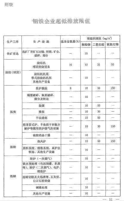 意見(jiàn)稿中,相應(yīng)的控制標(biāo)準(zhǔn)要求為:“燒結(jié)機(jī)頭煙氣、球團(tuán)焙燒煙氣在基準(zhǔn)含氧量16%條件下,顆粒物、二氧化硫、氮氧化物小時(shí)均值排放濃度分別不高于10、35、50毫克/立方米;其他污染源顆粒物、二氧化硫、氮氧化物小時(shí)均值排放濃度分別不高于10、50、150毫克/立方米,具體指標(biāo)限值見(jiàn)附表。在評(píng)估周期內(nèi),鋼鐵企業(yè)至少95%以上小時(shí)均值排放濃度滿(mǎn)足上述要求,方可認(rèn)定為達(dá)到超低排放水平。”
