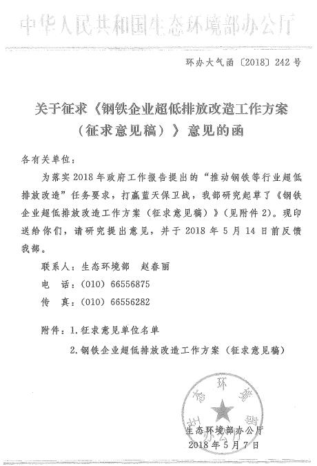 近期,生態(tài)環(huán)境部辦公廳發(fā)布關(guān)于征求《鋼鐵企業(yè)超低排放改造工作方案(征求意見(jiàn)稿)》意見(jiàn)的函。