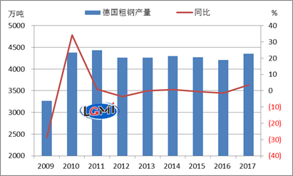 德國是歐盟的最大鋼鐵生產(chǎn)國,2017年德國生產(chǎn)粗鋼4356萬噸,同比增長3.5%;占歐盟28國累計產(chǎn)量的25.8%,位居世界第七位。