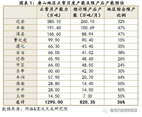 京津冀及周邊地區(qū)即“2+26”城市,采暖季限產(chǎn)涉及5省市,28城市98家鋼鐵企業(yè),343座高爐,產(chǎn)能3.1億噸,約占全國(guó)產(chǎn)能32%。其中河北省產(chǎn)能2.5億噸左右,而唐山產(chǎn)能在1.5億噸左右??梢?jiàn)2+26城市中唐山鋼鐵產(chǎn)能居首,幾乎占到2+26城市限產(chǎn)產(chǎn)能的50%,下面就以唐山為例,評(píng)估采暖季對(duì)2+26城市影響。