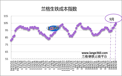 從圖1蘭格生鐵成本指數(shù)走勢圖可以看出,2018年9月份的生鐵成本指數(shù)呈持續(xù)上升走勢,由月初的98.2點(diǎn)變化至月末的104.3點(diǎn),均值較上月上升5.9%。