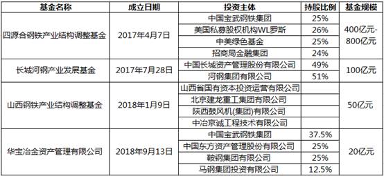 繼2017年中國寶武集團(tuán)聯(lián)合WL羅斯公司、中美綠色基金、招商局集團(tuán)設(shè)立四源合鋼鐵產(chǎn)業(yè)結(jié)構(gòu)調(diào)整基金整合重慶鋼鐵資產(chǎn)以來,另有長城河鋼產(chǎn)業(yè)發(fā)展基金、山西鋼鐵產(chǎn)業(yè)結(jié)構(gòu)調(diào)整基金、華寶冶金資產(chǎn)管理有限公司等三個并購基金陸續(xù)成立(詳見表1)。