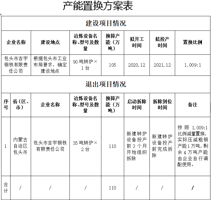 擬將現(xiàn)有的2臺35噸煉鋼轉(zhuǎn)爐進行內(nèi)部產(chǎn)能置換,新建一臺90噸煉鋼轉(zhuǎn)爐。按照《工業(yè)和信息化部關(guān)于印發(fā)鋼鐵水泥玻璃行業(yè)產(chǎn)能置換實施辦法的通知》(工信部產(chǎn)業(yè)[2017]337號)中的鋼鐵產(chǎn)能減量置換原則,依據(jù)產(chǎn)能換算表核算,現(xiàn)有2臺35噸煉鋼轉(zhuǎn)爐對應(yīng)產(chǎn)能共計為110萬噸(單臺產(chǎn)能55萬噸),新建一臺90噸煉鋼轉(zhuǎn)爐,對應(yīng)產(chǎn)能為105萬噸,剩余5萬噸煉鋼產(chǎn)能中1萬噸作為壓減產(chǎn)能,4萬噸作為該企業(yè)內(nèi)部產(chǎn)能自行調(diào)配使用,置換比例為1.009:1。按照鋼鐵產(chǎn)能置換的程序和要求,懇請自治區(qū)經(jīng)信委對包頭市吉宇鋼鐵有限責(zé)任公司鋼鐵產(chǎn)能置換方案予以公示公告。