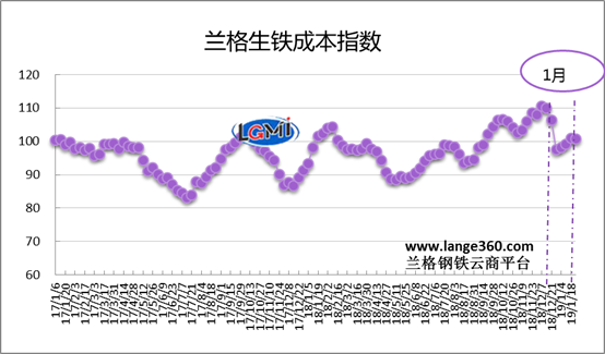 核心提示:導(dǎo)語(yǔ):2019年1月份蘭格生鐵成本指數(shù)為99.7點(diǎn),較上月下降6.8點(diǎn),降幅6.4%(上月升幅0.5%)(詳見圖1)。同期,蘭格鋼鐵綜合價(jià)格指數(shù)