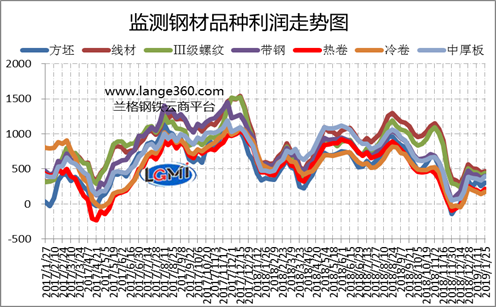 圖2是蘭格鋼鐵云商平臺(tái)監(jiān)測(cè)的各主要鋼材品種的盈利能力曲線對(duì)比。從圖2可以看出, 2019年1月份7大品種測(cè)算毛利呈小幅波動(dòng)態(tài)勢(shì),1月各品種平均毛利較上月上升87元-190元/噸;其中中厚板毛利上升最多,為190元/噸;高線毛利上升最少,為87元/噸;其他品種盈利上升幅度在97-172元/噸之間。