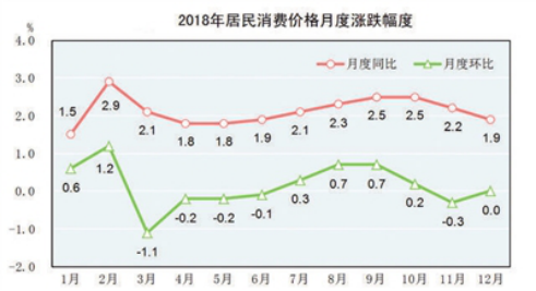 數(shù)據(jù)顯示,2018年全年居民消費(fèi)價(jià)格比上年上漲2.1%,低于3%左右的預(yù)期目標(biāo)。其中,食品煙酒價(jià)格比上年上漲1.9%,衣著價(jià)格上漲1.2%,生活用品及服務(wù)價(jià)格上漲1.6%,均低于居民消費(fèi)價(jià)格總漲幅。