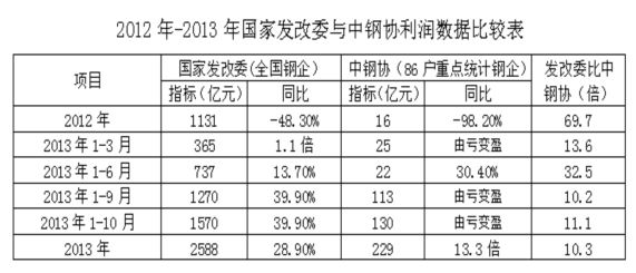 以上數(shù)據(jù)比較可見(jiàn),2012年發(fā)改委利潤(rùn)數(shù)據(jù)比中鋼協(xié)的多69.7倍,2013年又比中鋼協(xié)多10.35倍,兩組數(shù)據(jù)的差距之大,不僅令業(yè)內(nèi)“大跌眼鏡”,而且無(wú)所適從,因?yàn)楫吘箖山M數(shù)據(jù)都出于政府權(quán)威部門。所以筆者認(rèn)為,為避免誤讀、誤解、誤調(diào),規(guī)范并統(tǒng)一數(shù)據(jù)發(fā)布刻不容緩。