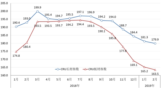 2月末,CSPI長(zhǎng)材指數(shù)為113.43點(diǎn),環(huán)比上升1.44點(diǎn),升幅為1.29%;CSPI板材指數(shù)為104.02點(diǎn),環(huán)比上升1.49點(diǎn),升幅為1.45%,比長(zhǎng)材價(jià)格升幅高0.16個(gè)百分點(diǎn);與去年同期相比,長(zhǎng)材價(jià)格指數(shù)下降6.93點(diǎn),降幅為5.76%;板材價(jià)格指數(shù)下降8.55點(diǎn),降幅為7.60%。(見下圖、表)