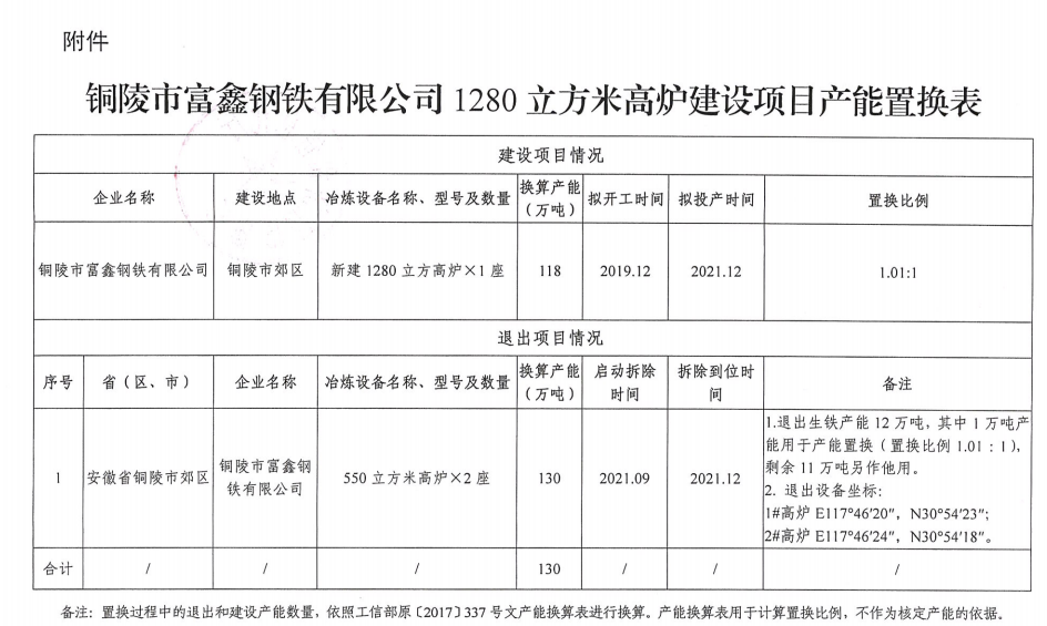 按照《國(guó)務(wù)院關(guān)于化解產(chǎn)能?chē)?yán)重過(guò)剩矛盾的指導(dǎo)意見(jiàn)》《國(guó)務(wù)院關(guān)于鋼鐵行業(yè)化解過(guò)剩產(chǎn)能實(shí)現(xiàn)脫困發(fā)展的意見(jiàn)》和《鋼鐵行業(yè)產(chǎn)能置換實(shí)施辦法》要求,現(xiàn)將銅陵市富鑫鋼鐵有限公司1280立方米高爐建設(shè)項(xiàng)目產(chǎn)能置換方案予以公告,歡迎社會(huì)公眾進(jìn)行監(jiān)督。