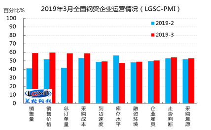 3月份鋼材市場需求釋放較為順暢,鋼鐵流通企業(yè)銷售量指數(shù)和訂單指數(shù)大幅回升至59.3和58.8,較上月分別回升17.9、和17.1個百分點。指數(shù)大幅回升的原因一部分在于今年春季需求準時釋放,另一部分在于上月受春節(jié)因素銷售淡季基數(shù)過低。