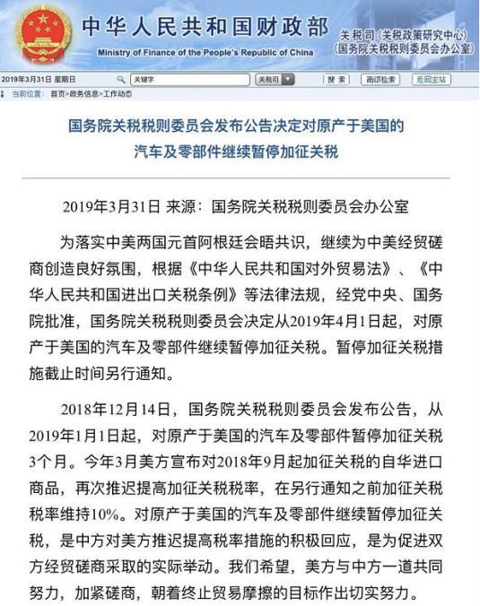 為落實(shí)中美兩國元首阿根廷會(huì)晤共識(shí),繼續(xù)為中美經(jīng)貿(mào)磋商創(chuàng)造良好氛圍,根據(jù)《中華人民共和國對(duì)外貿(mào)易法》、《中華人民共和國進(jìn)出口關(guān)稅條例》等法律法規(guī),經(jīng)黨中央、國務(wù)院批準(zhǔn),國務(wù)院關(guān)稅稅則委員會(huì)決定從2019年4月1日起,對(duì)原產(chǎn)于美國的汽車及零部件繼續(xù)暫停加征關(guān)稅。暫停加征關(guān)稅措施截止時(shí)間另行通知。