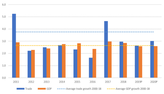 WTO預(yù)計(jì),全球GDP增長率將從2018年的2.9%放緩至2019年和2020年的2.6%。同時(shí),在2018年,貿(mào)易增長速率(3.0%)僅比全球GDP增長速率(2.9%)略高,而這種疲軟狀態(tài)至少會(huì)延伸至2019年。WTO并指出,部分原因是因?yàn)闅W盟經(jīng)濟(jì)增長放緩,其在全球貿(mào)易中的份額要大于其在全球GDP中的份額。