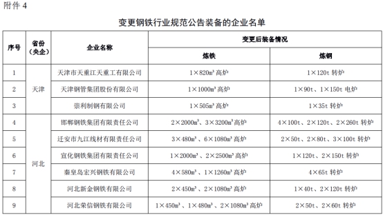 新增的第四批符合規(guī)范條件的鋼鐵企業(yè)共計(jì)12家,而此次撤銷規(guī)范的鋼鐵企業(yè)共計(jì)11家,因此,鋼鐵規(guī)范企業(yè)總數(shù)變?yōu)?57家。本次新增和撤銷規(guī)范鋼鐵企業(yè)名單如下——