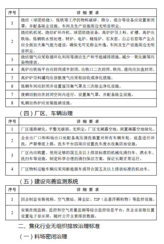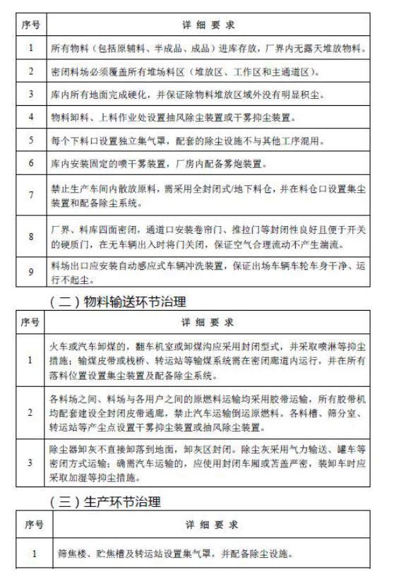 (一)明確治理范圍。2019年10月底前,全省范圍內(nèi)鋼鐵、水泥、火電、焦化、鑄造、耐火材料、有色冶煉、磚瓦窯等所有涉及無組織排放的工業(yè)企業(yè),完成物料運(yùn)輸、生產(chǎn)工藝、堆場(chǎng)環(huán)節(jié)的無組織排放深度治理,全面實(shí)現(xiàn)“五到位、一密閉”。
