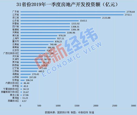 從各省份數(shù)據(jù)來看,廣東房地產(chǎn)開發(fā)投資以2778.68億元位居首位,江蘇、浙江緊跟其后。2019年一季度,廣東、江蘇、浙江房地產(chǎn)開發(fā)投資額均超過2000億大關(guān)。