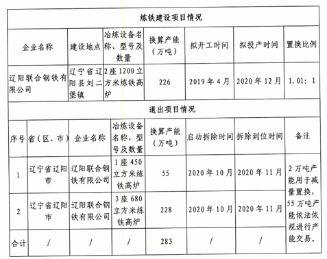 遼陽(yáng)聯(lián)合鋼鐵有限公司鋼鐵建設(shè)項(xiàng)目產(chǎn)能置換方案公告