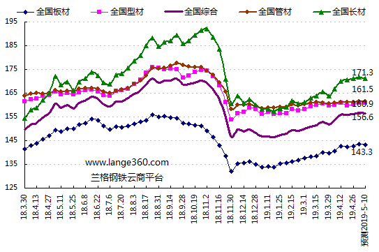 2019年第18周(2019.4.28-5.5)蘭格鋼鐵全國鋼材綜合價(jià)格指數(shù)達(dá)到156.9點(diǎn),較上周上升0.45%,較去年同期下降2.11%。其中,LGMI長(zhǎng)材價(jià)格指數(shù)為171.8點(diǎn),較上周上升0.46%,較去年同期上升0.13%;LGMI型材價(jià)格指數(shù)為160.9點(diǎn),較上周上升0.48%,較去年同期下降2.83%;LGMI板材價(jià)格指數(shù)為143.4點(diǎn),較上周上升0.51%,較去年同期下降3.96%;LGMI管材價(jià)格指數(shù)為161.5點(diǎn),較上周上升0.31%,較去年同期下降2.81%。