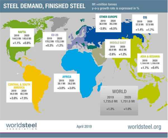 世界鋼鐵協(xié)會近日發(fā)布了2019年4月版短期鋼鐵需求預(yù)測結(jié)果。據(jù)預(yù)測,2019年全球鋼鐵需求將達到17.35億噸,同比增長1.3%。2020年,鋼鐵需求預(yù)計將增長1.0%,達到17.52億噸。