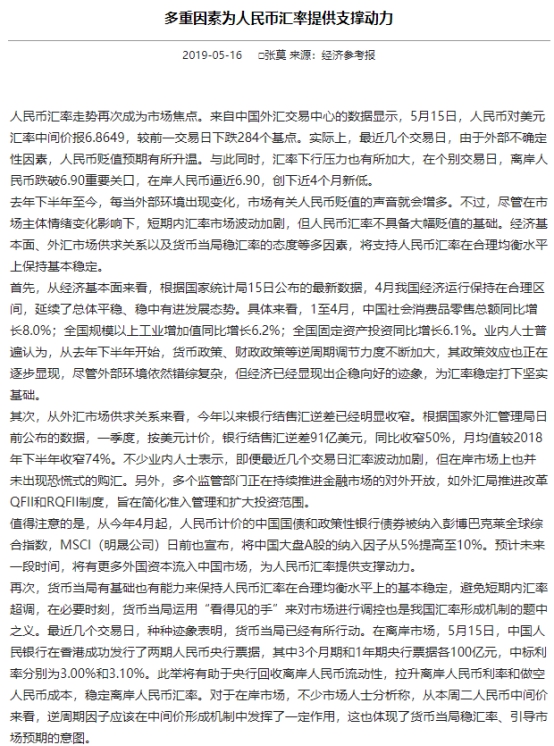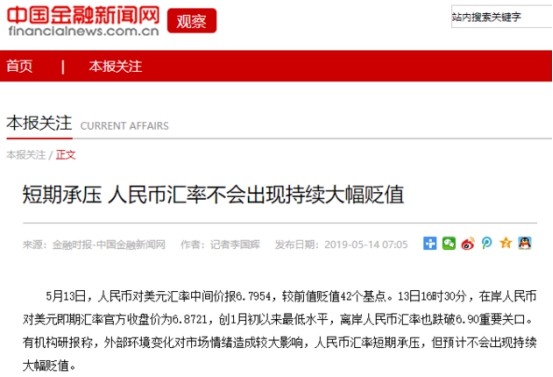 在《經(jīng)濟(jì)參考報(bào)》發(fā)布文章之前,央行主管媒體《金融時(shí)報(bào)》發(fā)布題為《人民幣匯率不會(huì)出現(xiàn)持續(xù)大幅貶值》的文章指出,監(jiān)管部門此前多次強(qiáng)調(diào),不會(huì)搞競(jìng)爭(zhēng)性貶值,不會(huì)將人民幣匯率作為工具來(lái)應(yīng)對(duì)貿(mào)易爭(zhēng)端等外部的擾動(dòng)。