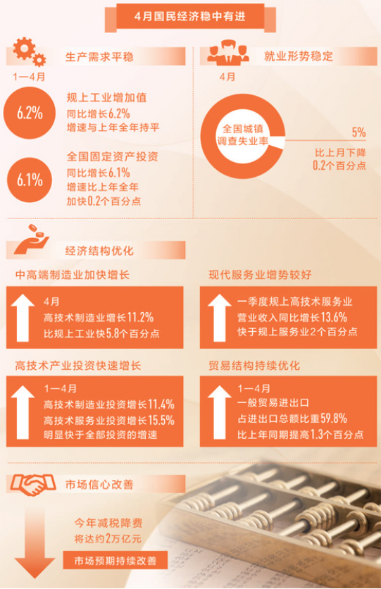 “判斷經(jīng)濟形勢還是要把這些短期因素過濾掉。從前4個月整體經(jīng)濟運行來看,總體平穩(wěn)、穩(wěn)中有進這個態(tài)勢是沒有改變的。”劉愛華說,在經(jīng)濟運行平穩(wěn)的同時,經(jīng)濟結構繼續(xù)優(yōu)化。