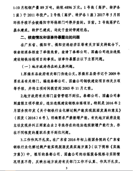 部際聯(lián)席會議核查發(fā)現(xiàn),原揭東縣政府有關(guān)部門偽造公文,編造兩家公司鋼鐵建設(shè)項目相關(guān)立項手續(xù),并將立項時間提前到2003年11月之前。廣東省2016年初上報國務(wù)院的相關(guān)文件中,填寫的泰都公司、國鑫公司的冶煉裝備與實際情況明顯不符。此外,泰都公司、國鑫公司明知其鋼鐵項目有關(guān)立項手續(xù)是編造的情況下,仍將有關(guān)手續(xù)提供給有關(guān)方面,騙取支持;兩家公司在開工許可及環(huán)評手續(xù)不齊全的情況下,頂風(fēng)違法違規(guī)建設(shè)2號線。