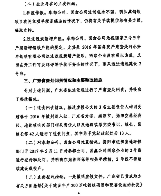 針對上述問題,廣東省依法依規(guī)進(jìn)行了嚴(yán)肅查處,編造虛假公文的3名主要負(fù)責(zé)人均因受賄罪于2016年被判刑入獄,相關(guān)政府部門負(fù)責(zé)人等42人也分別被追責(zé)問責(zé)和處理。泰都公司、國鑫公司違法違規(guī)建設(shè)項目被依法查封,并明確須完善環(huán)保等相關(guān)手續(xù),嚴(yán)格執(zhí)行化解鋼鐵行業(yè)過剩產(chǎn)能的相關(guān)規(guī)定,進(jìn)行減量置換后,有關(guān)項目方可繼續(xù)建設(shè)。