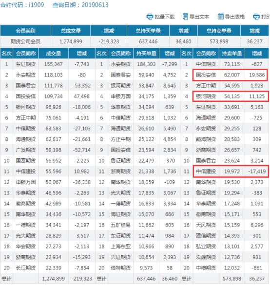 礦石方面多頭大哥永安終于減倉了,雖然只有區(qū)區(qū)7千多手,但似乎與坊間傳說的20萬手限倉有微妙的聯(lián)系;多頭第三銀河增倉近9千手,似乎在努力追趕者第二名的位置;空頭方面安信大幅增倉近2萬手,從第五名一躍到空頭榜第二;銀河增倉1萬多手名次稍有提升;中信則減倉1.7萬手跌出前十。如此看來今天行情似乎空頭比多頭更活躍。