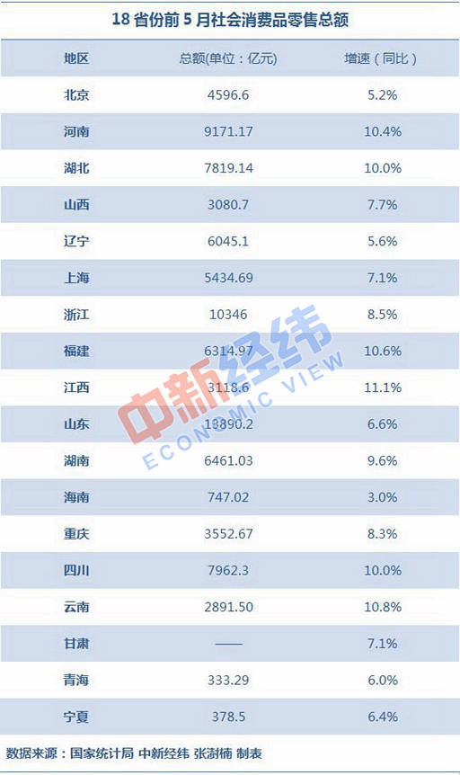 中新經(jīng)緯客戶(hù)端梳理發(fā)現(xiàn),河南、湖北、浙江、福建、江西、湖南、重慶、四川、云南9省份社會(huì)消費(fèi)品零售總額增速跑贏全國(guó)。